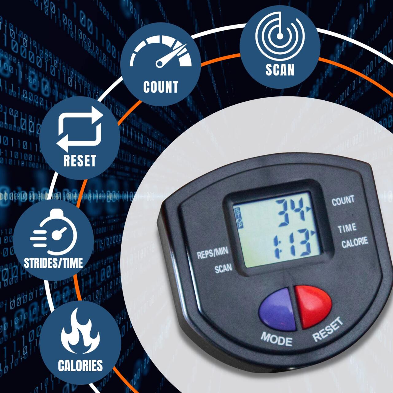Pantalla multifunción: muestra repeticiones totales, velocidad (reps/minuto), tiempo y calorías